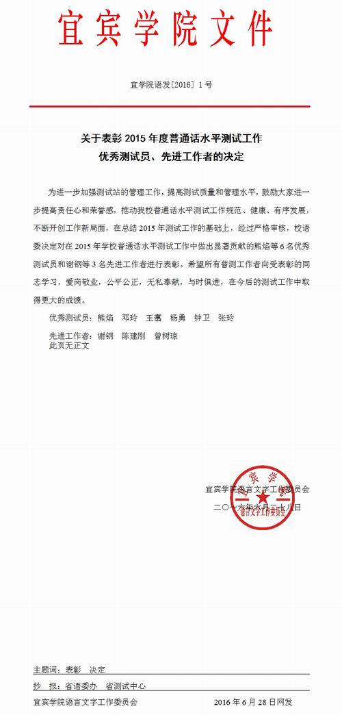 关于表彰2015年度普通话水平测试工作优秀测试员、先进工作者的决定