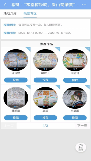 习近平总书记强调:“要坚定文化自信、担当使命、奋发有为,共同努力创造属于我们这个时代的新文化,建设中华民族现代文明。”为深入落实习近平总书记关于宣传传统文化的相关讲话精神,传承二十四节气优秀传统文化,并提升老员工的文化自信,10月6日,教育学部开展“寒露惊秋晚,香山菊渐黄”手抄报设计大赛,并于10月14日上午9:00借助易班APP进行人气作品投票。