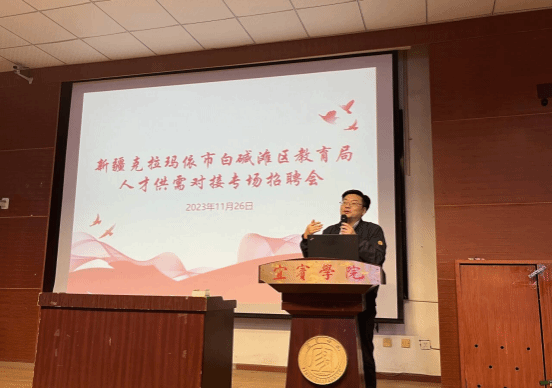 为深入学习贯彻习近平总书记关于做好高校毕业生就业工作的重要指示精神,将党中央“就业优先”战略落实落细,切实践行以“人民至上”“员工中心”的理念,促进2024届毕业生高质量就业、拓宽就业渠道,11月26日,教育学部在三教A101开展新疆克拉玛依市白碱滩区教育局人才供需对接专场招聘会。克拉玛依市白碱滩区委教育工委专职副书记、区教育局党组书记李江生,区人社局工资科科长陈蕾,区教育局人事科主任赵华,中兴-跃进幼儿园党支部书记兼园长雷辛,克拉玛依市第五中学体育教研组长韩猛,教育学部党总支副书记李伟,学工办全体工作人员参会,会议由李伟主持。