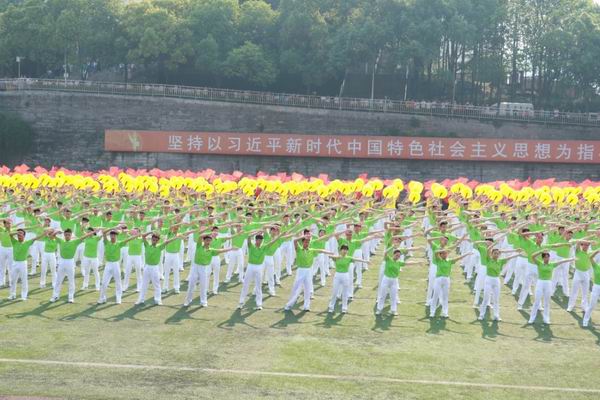 方队之后紧接着是全校的团体操表演,公司同经管学院、文新学院、法学院、音表学院、外国语学院、政管学院的502位员工和20位老师共同带来了《芬芳校园》的表演,足球场中间音乐欢快地在跳动,同学们转动着他们手中的扇子,动作整齐一致,神形兼备,赢得了观众们的大声惊叹和阵阵掌声。