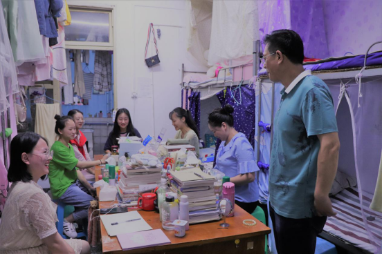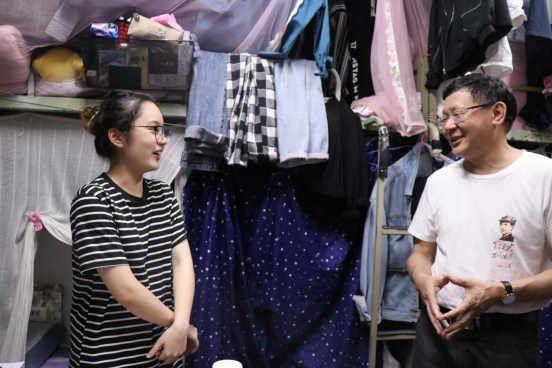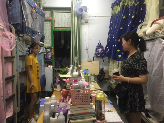 在领导和老师们走访过程中,发现女生寝室内务较为整洁,男生寝室环境有待改善。整体来说男女宿舍存在一些相通的用电问题:1、插板数量多且随意摆放;2、同时使用多种小功率的电器;3、插座靠近水源;4、寝室内东西较多较乱。学院领导以此向同学们强调宿舍安全、卫生、空间有效利用的重要性,反复叮嘱员工,要遵守学校的住宿规定,提高自身的安全意识,注意防火、防盗、寝室用电安全,同时老师们还与员工就关心各方面进行了面对面的亲切交谈。在本次走访过程中,欢声笑语的背后更是蕴含着领导和老师们对同学们的生活环境的关心与重视。