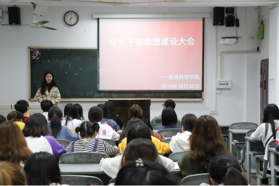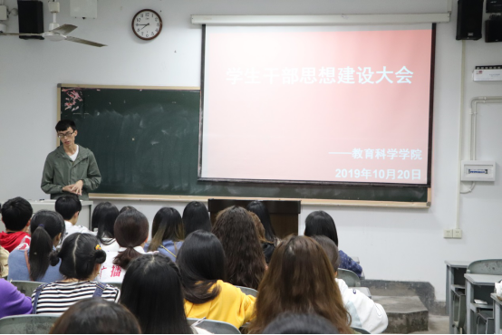 为促进员工干部队伍的管理服务水平,提高干部能力素质。2019年10月20日19:30,教育科学学院团总支员工会在一教208教室开展了“员工干部政治思想建设大会”。专职辅导员聂凤老师、团总支员工会主席团以及全体员工干部参加了此次大会。