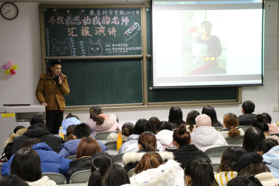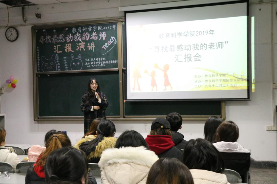 为传递感恩教育,大力弘扬人民教师爱岗、敬业、奉献精神,营造出尊师重教的良好氛围,2019年12月25日晚,教育科学学院在一教201教室开展了“寻找最感动我的老师”院级汇报会。教育科学学院团总支副书记雷琳、王瑾慧、员工会副主席何传亮,参加活动并担任评委。