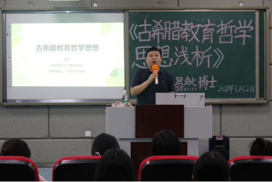 2021年6月2日19:00,海南师范大学教育学院副教授易然博士在博雅楼B座201室作了“古希腊教育哲学思想浅析”的专题讲座。