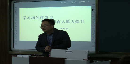 付有能以播放视频《张晓凤:我交给你一个孩子》引入讲座主题,其讲座内容分为三个部分:一是系统介绍学习的类型及其过程,提出学习从不同维度可分为独立学习与交往学习、外向学习与反思学习、经验学习与符号学习等种类,从学习主体、内容、目标、手段、方式、方法、时间、空间、效果等方面对学习过程进行理解阐释;二是分析讲解学习场的理解与构建,认为学习场主要有立场、在场、场景与场域四种类型,并就如何正解理解与积极建构问题发表了自己见解;三是深入阐述教师育人能力的提升,特别强调了教师自我修炼之道,提出教师要注重课堂变革,要增强精神感召力,要积极深入开展教育研究。最后,付有能与听讲座员工就相关问题进行了充分互动交流。