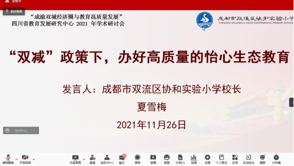 双流区协和实验小学党支部书记、董事长、成都市第三届名董事长工作室领衔人夏雪梅老师做“‘双减’政策下,办好高质量的怡心生态教育”主题发言,以协和实验小学为例,对于如何减,如何加,如何做到高质量发展抛出8个观点和做法:1.提高政治站位,贯彻政策落实;2.立足全面发展,培养时代新人;3.统筹作业管理,做好评价导向;4.变革课堂模式,实现教学增值;5.优化育人环境,守护身心健康;6.注重教师专业,加强培训研究;7.做好课后服务,促进个性成长;8.做好家校共育,缓解家长焦虑。