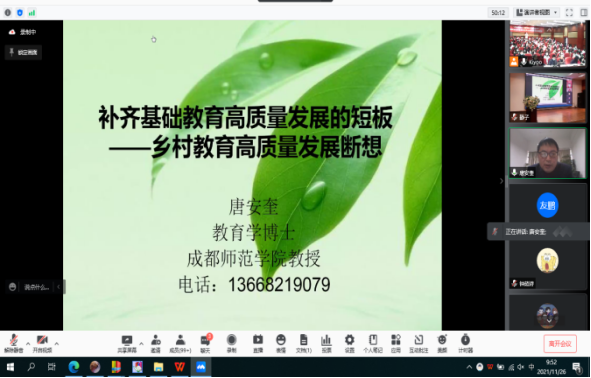 成都师范学院教育与心理学院经理、四川省教育学会教育学专业委员会理事长唐安奎教授做“补足基础教育高质量发展的短板——乡村教育高质量发展断想”主题发言,指出当下乡村社会结构性变迁,村落组织规模变小,乡村生活观念及方式改变,城乡之间交流便捷与频繁,乡土气息变淡,乡村教育高质量发展关键在于乡村教育全面振兴,补齐农村教育相对落后的短板,实现优质教育的城乡均衡和区域均衡。