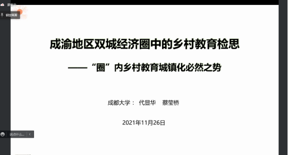 成都大学《教育与教学研究》期刊社主编代显华教授做 “成渝双城经济圈中的乡村教育检思” 主题发言,指出成渝地区双城经济圈中乡村教育现状:1、办学条件改善明显,但学校教育经费仍显不足;2、乡村教师队伍结构性缺编,且向城市流动的心理仍明显,乡村教师在城乡间“候鸟化”工作成为常态;3、乡村员工向城市流动仍很明显,一些地区呈现出低龄化、跨区域的流动;4、乡村学校布局调整仍有很大必要,但多维持现状。