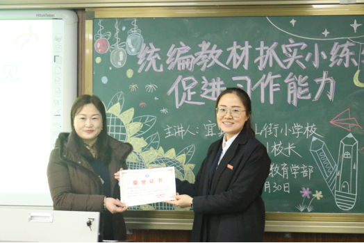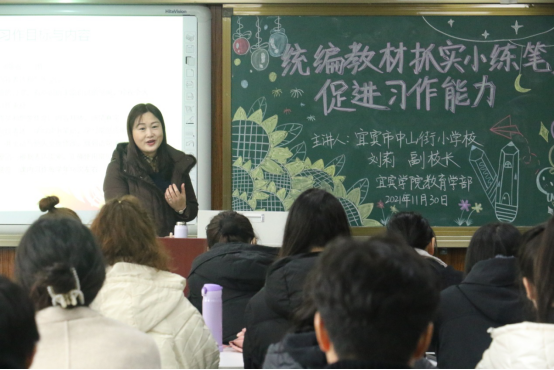 2021年11月30日下午,宜宾市中山街小学刘莉副董事长在博雅楼B501做“统编教材抓实小练笔,促进习作能力”专题讲座,教育学部小学教育专业员工到场聆听,活动由教育学部科研办副主任郑婉秋博士主持。